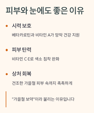베타카로틴과 비타민 A는 시력 보호와 망막 건강을 돕고, 비타민 C와 E는 피부 탄력 유지, 색소 침착 완화, 상처 회복에 유익한      영양소입니다.