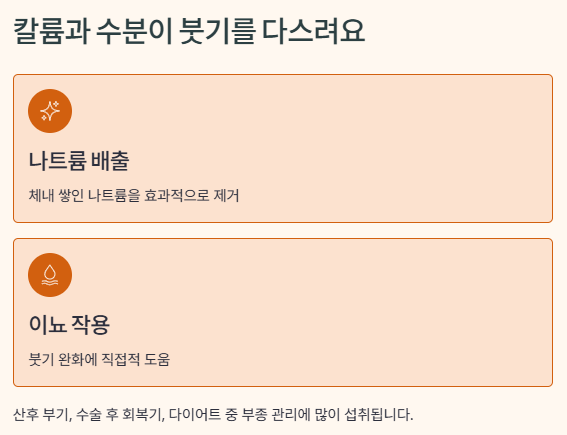칼륨이 풍부한 늙은 호박은 체내에 쌓인 나트륨을 배출하고 이뇨 작용을 촉진해, 붓기 완화에 도움을 줄 수 있습니다. 산후 부기, 수술 후 회복기, 다이어트 중 부종 관리를 위해 섭취하는 분들도 많습니다.
