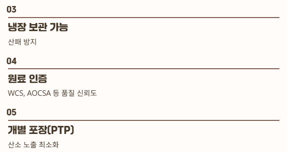 ✔ 원료 인증 (WCS, AOCSA 등)