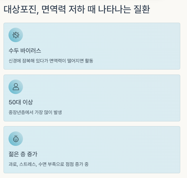 대상포진은 수두 바이러스가 신경에 잠복해 있다가 면역력이 떨어졌을 때 다시 활동하며 발생하는 질환입니다. 50대 이상 중장년층에서 많이 생기지만, 요즘은 과로, 스트레스, 수면 부족으로 젊은 층에서도 점점 증가하고 있어요.