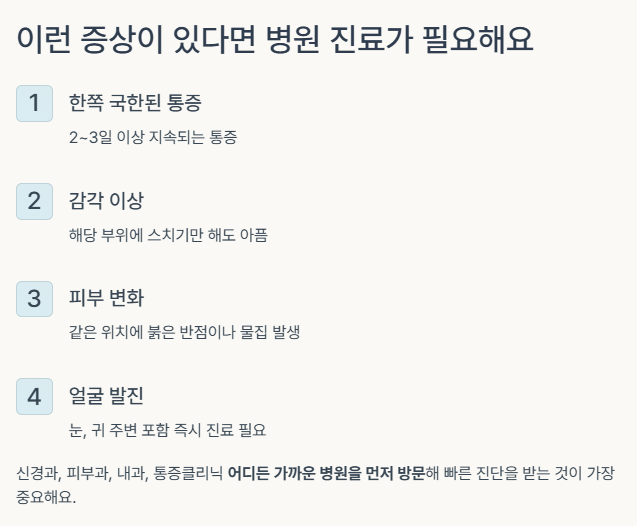 이때는 신경과, 피부과, 내과, 통증클리닉 어디든 가까운 병원을 먼저 방문해 빠른 진단을 받는 것이 가장 중요해요.