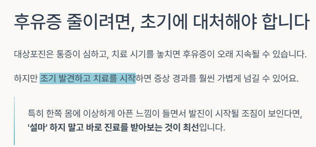 특히 한쪽 몸에 이상하게 아픈 느낌이 들면서 발진이 시작될 조짐이 보인다면, ‘설마’ 하지 말고 바로 진료를 받아보는 것이 최선입니다.