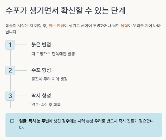 | 수포 → 딱지 형성 | 통증 지속 | 합병증 가능성 있음 |