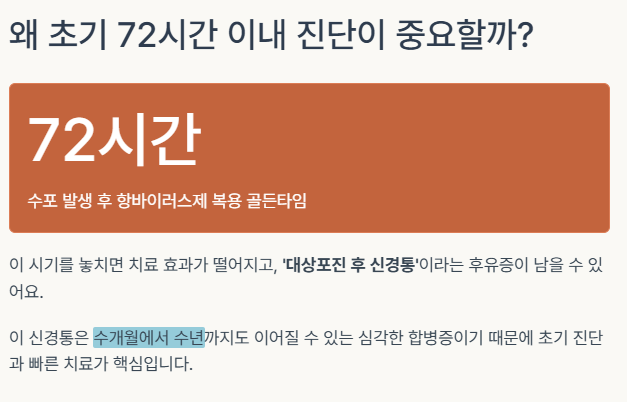 이 신경통은 수개월에서 수년까지도 이어질 수 있는 심각한 합병증이기 때문에 초기 진단과 빠른 치료가 핵심입니다.