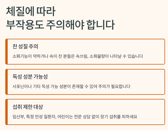임산부, 특정 만성 질환자, 어린이는 전문 상담 없이 장기 섭취를 피하는 것이 좋습니다.