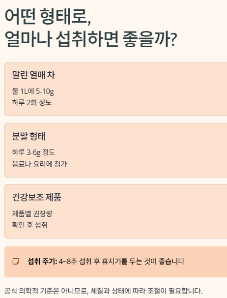 | 말린 열매 차 | 1일 5–10 g 정도 (물 1L 기준) |