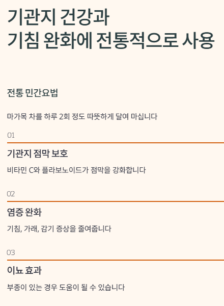 | 기관지 건강 | 카로틴, 플라보노이드 | 기침, 가래 완화 |