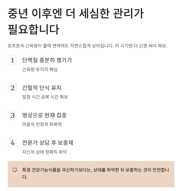 중년이 되면 자연스럽게 호르몬과 근육량이 줄어들며, 면역력도 이전보다 낮아지는 경향이 있습니다.