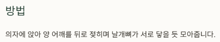 | 날개뼈 모으기 | 승모근·사각근 | 어깨 안정화 | 허리 꺾이지 않게 주의 |