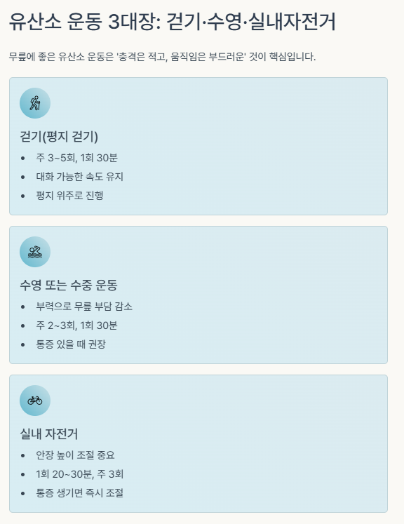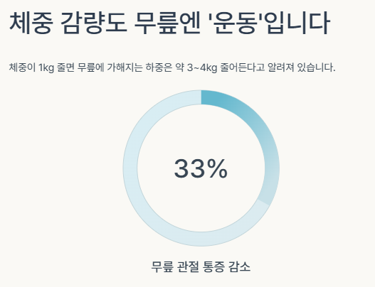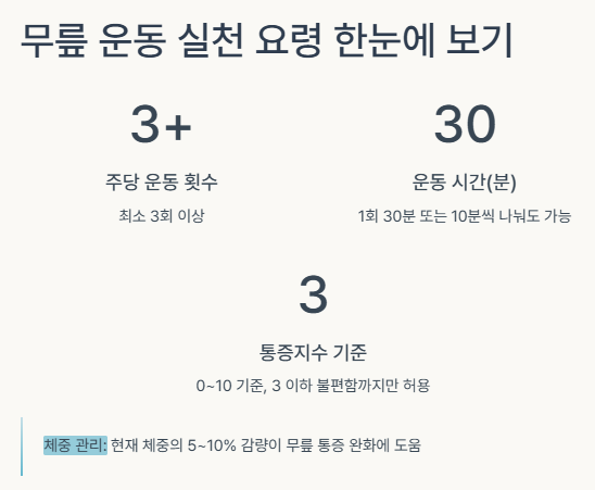 | 체중 관리 | 현재 체중의 5~10% 감량이 무릎 통증 완화에 도움 |
