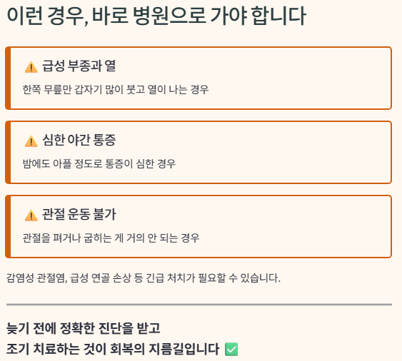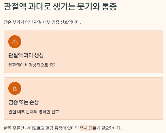 이런 증상은 감염성 관절염, 급성 연골 손상, 활액막 파열 등 긴급한 처치가 필요한 상태일 수 있습니다.