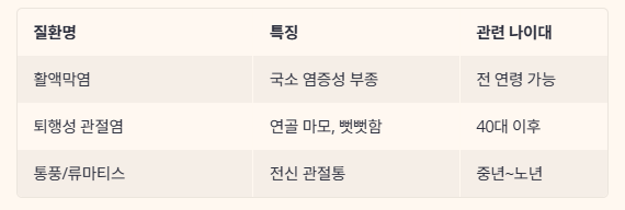 - 류마티스·통풍·화농성 관절염: 전신 염증질환이나 감염이 관절에 영향을 주는 경우