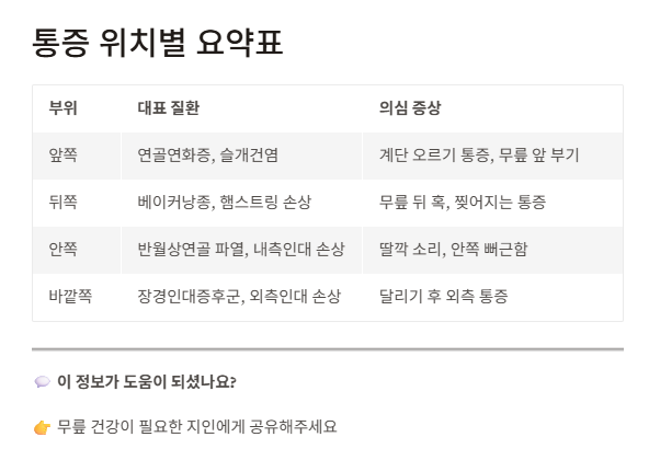 앞·뒤·안쪽·바깥쪽 어디가 아픈지에 따라 연골, 인대, 점액낭 또는 심지어 전신 질환까지 연관될 수 있죠.