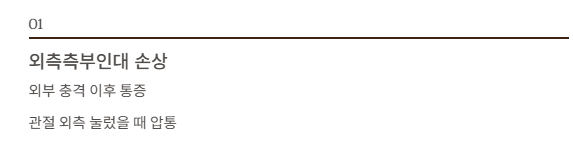 | 외측측부인대 손상 | 외부 충격 이후 통증 | 관절 외측 눌렀을 때 압통 |
