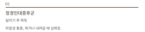 | 장경인대증후군 | 달리기 후 찌릿 | 마찰성 통증, 뛰거나 내려갈 때 심해짐 |