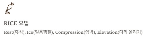| RICE 요법 | Rest(휴식), Ice(얼음찜질), Compression(압박), Elevation(다리 올리기) |