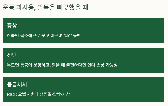 - RICE 요법(휴식·냉찜질·압박·거상)으로 초기 대응