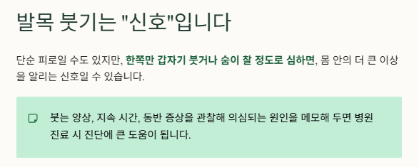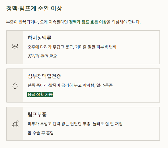 | 심부정맥혈전증 | 한쪽 종아리·발목이 급격히 붓고 딱딱함, 열감·통증 | 응급 상황 가능 |