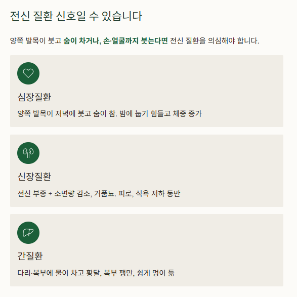 양쪽 발목이 붓고 숨이 차거나, 손·얼굴까지 붓는다면 아래와 같은 전신 질환을 의심해야 합니다.