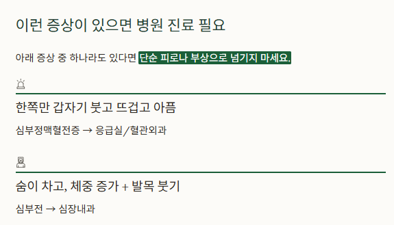 | 심부정맥혈전증 | 한쪽 종아리·발목이 급격히 붓고 딱딱함, 열감·통증 | 응급 상황 가능 |