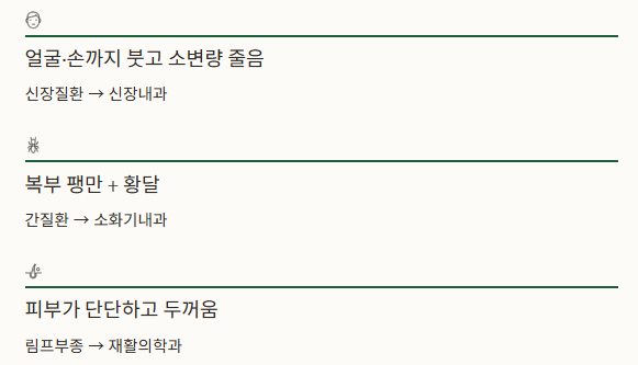 | 붓기 지속 + 복부 팽만 + 황달 | 간질환 | 소화기내과 |