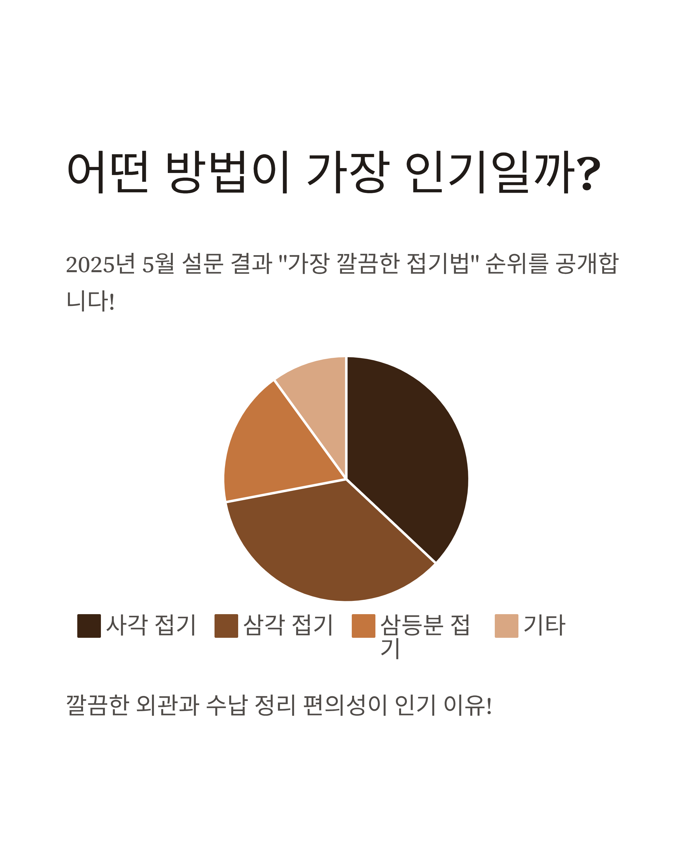 "가장 깔끔한 접기법"으로 사각 접기 37%, 삼각 접기 35%, 삼등분 접기 18%로 나타났어요.