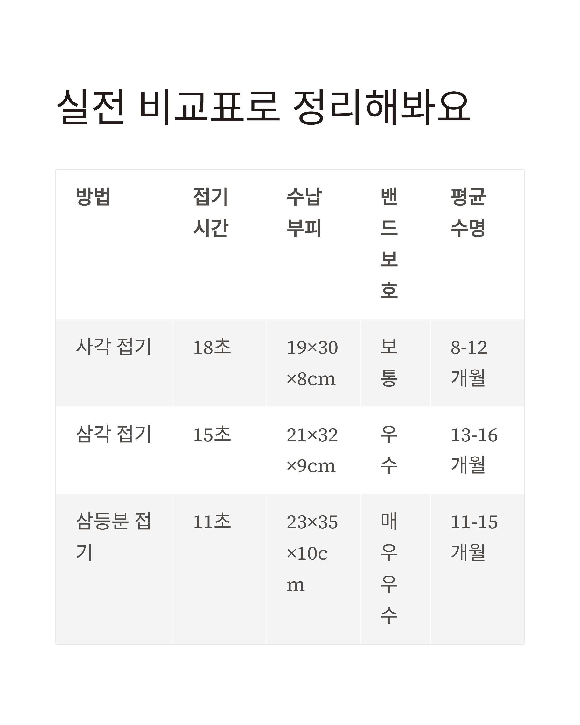 | 사각 접기 | 18초 | 19 x 30 x 8cm | 보통 | 8~12개월 |