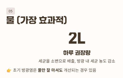 - 물 2L 이상 섭취 필수