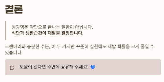 특히 방광염은 음식과 수분 섭취가 증상에 직접적인 영향을 주는 질환입니다.
