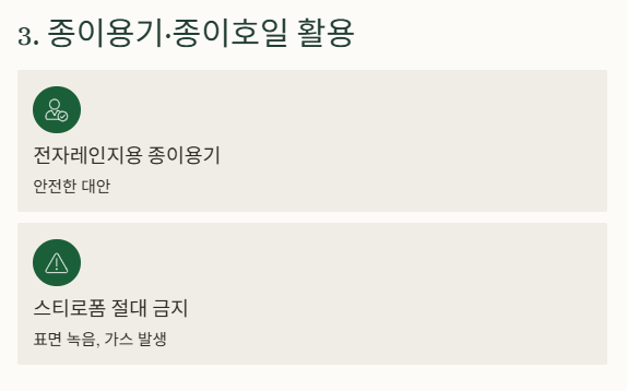 전자레인지용 종이용기나 종이호일도 나쁘지 않은 대안입니다. 단, 컵라면에 흔히 쓰이는 스티로폼(P.S)은 반드시 피하세요. 표면이 녹거나, 가스가 발생할 수 있습니다.