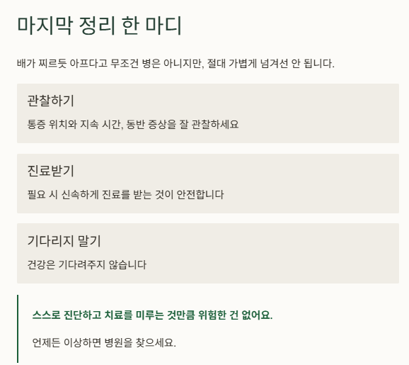 이런 신호가 보인다면 응급실이나 내과 진료를 즉시 받아야 합니다. 복통의 원인은 너무나 다양하기 때문에 스스로 판단하기보단 전문가의 진료가 최선입니다.