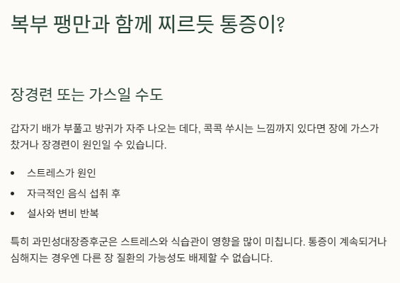 다만 통증이 계속되거나, 심해지는 경우엔 다른 장 질환의 가능성도 배제할 수 없습니다.