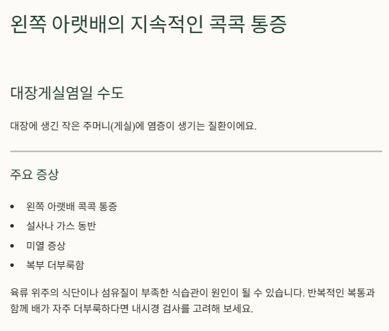 | 왼쪽 아랫배 | 대장게실염 | 복부팽만, 설사, 발열 |