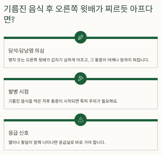 기름진 음식을 먹은 직후 통증이 시작된다면 특히 주의가 필요해요. 열이나 황달이 함께 나타나면 응급실로 바로 가야 합니다.
