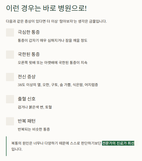 이런 신호가 보인다면 응급실이나 내과 진료를 즉시 받아야 합니다. 복통의 원인은 너무나 다양하기 때문에 스스로 판단하기보단 전문가의 진료가 최선입니다.