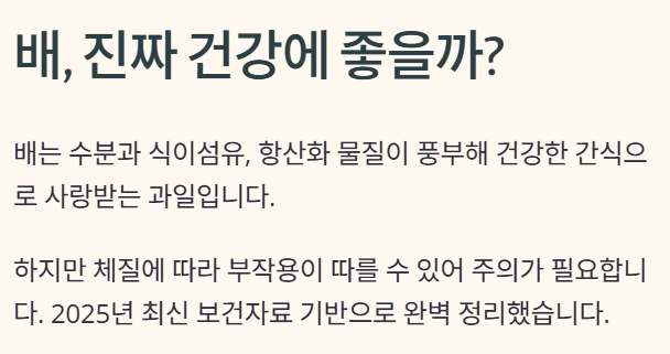 배는 수분과 식이섬유, 항산화 물질이 풍부해 건강한 간식으로 사랑받는 과일입니다. 특히 기관지 건강, 숙취 해소, 변비 개선에 좋다고 알려져 있는데요. 하지만 아무리 몸에 좋아도 체질에 따라 부작용이 따를 수 있어 주의가 필요합니다. 이 글에서는 2025년 최신 보건자료와 임상연구를 기반으로 배의 효능과 부작용, 주의사항까지 한눈에 정리해드립니다.