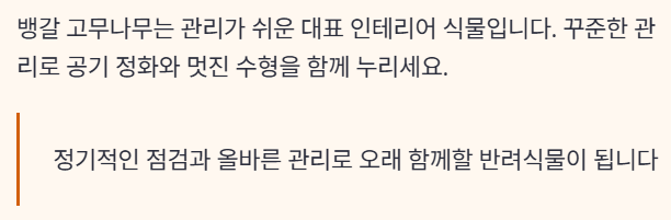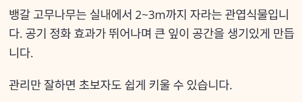 뱅갈 고무나무는 실내에서도 관리가 쉬운 대표적인 인테리어 식물입니다. 생장 조건만 잘 맞춰주면 꾸준히 성장하고 공기 정화에도 도움을 줍니다. 광도, 온도, 습도, 물 주기, 비료 주기 등 기본 관리법을 꾸준히 실천하면 초보자도 건강하게 키울 수 있는 식물입니다. 특히 뱅갈 고무나무는 수형이 멋지고 잎이 크고 진해 실내 공간을 생기 있고 세련되게 만들어주는 효과도 탁월합니다.