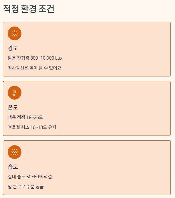 생육 적정온도는 18~26도이며, 겨울철에는 최소 10~13도 이상을 유지해야 합니다. 10도 이하로 내려가면 냉해로 인해 잎이 떨어질 수 있으므로 주의해야 합니다.