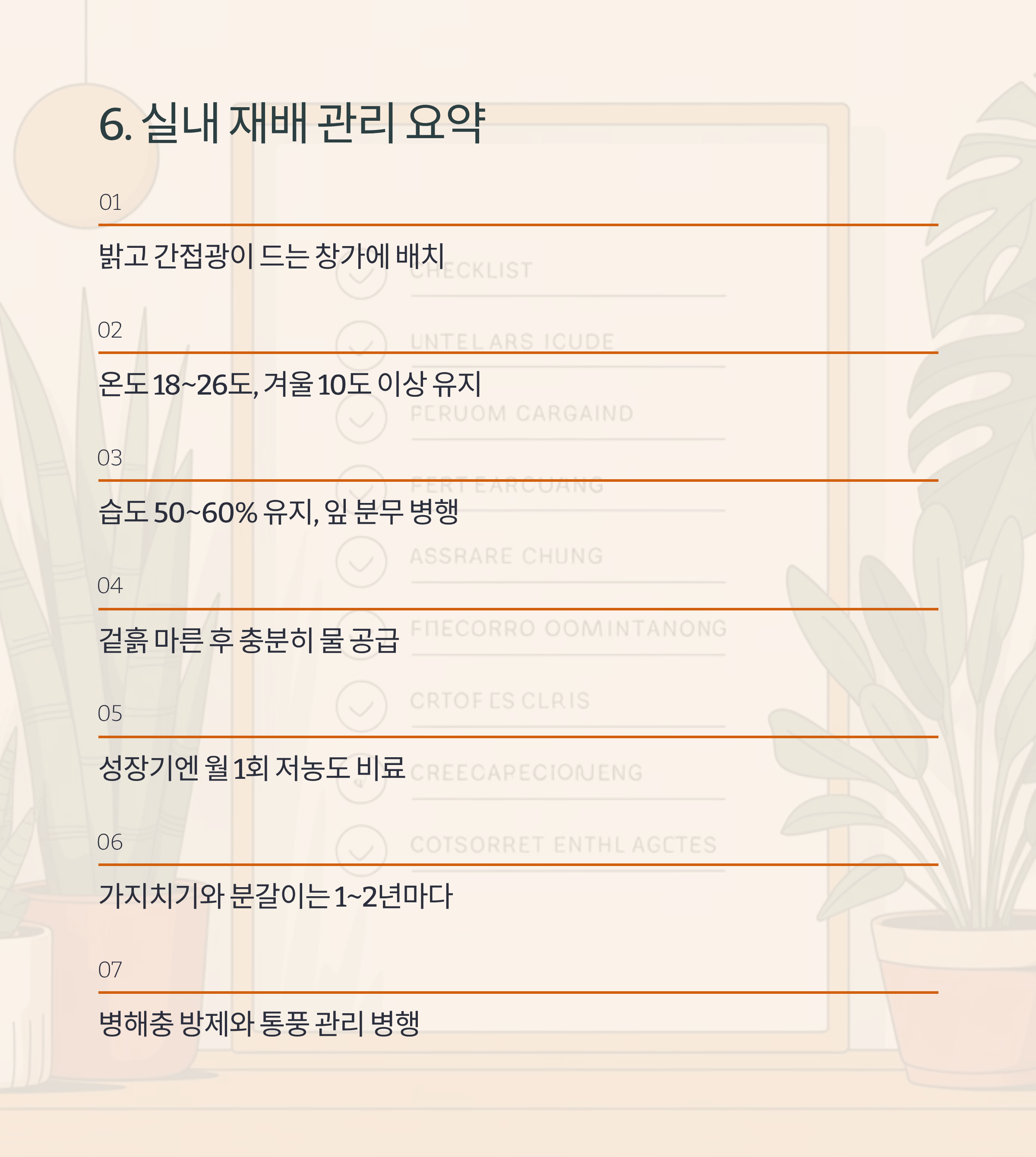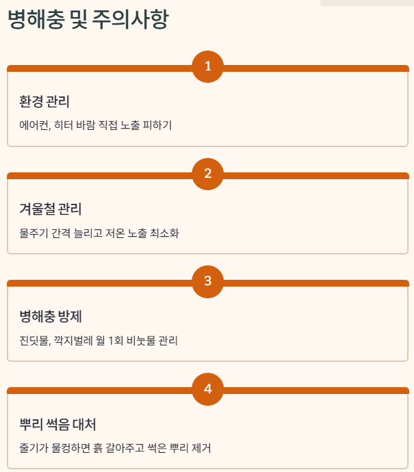 - 겨울철에는 물주기 간격을 늘리고, 저온 노출을 최소화합니다.