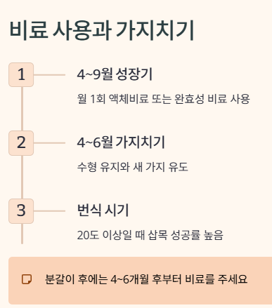 가지치기는 4~6월 사이에 시행하며, 수형 유지와 새로운 가지 유도를 위해 필요합니다. 잘라낸 가지는 수경재배나 삽목으로 번식할 수 있으며, 온도가 20도 이상일 때 뿌리 내림 성공률이 높습니다.