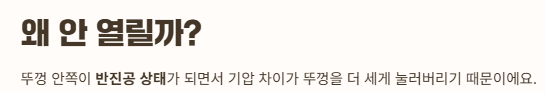 - “벌어진 틈으로 공기가 들어가면서” 안팎 압력이 같아져서 갑자기 쉬워집니다.