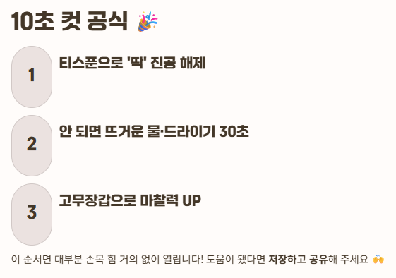 - 손힘 약하거나 미끄러움: ✅ 고무장갑 → 그래도 안 되면 틈 벌리기