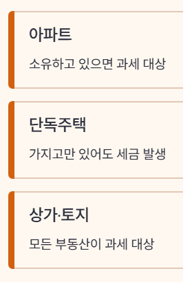 부동산 보유세는 아파트, 단독주택, 상가, 토지 등 어떤 형태의 부동산이든 ‘소유하고 있다는 사실’ 자체에 대해 과세되는 세금입니다.