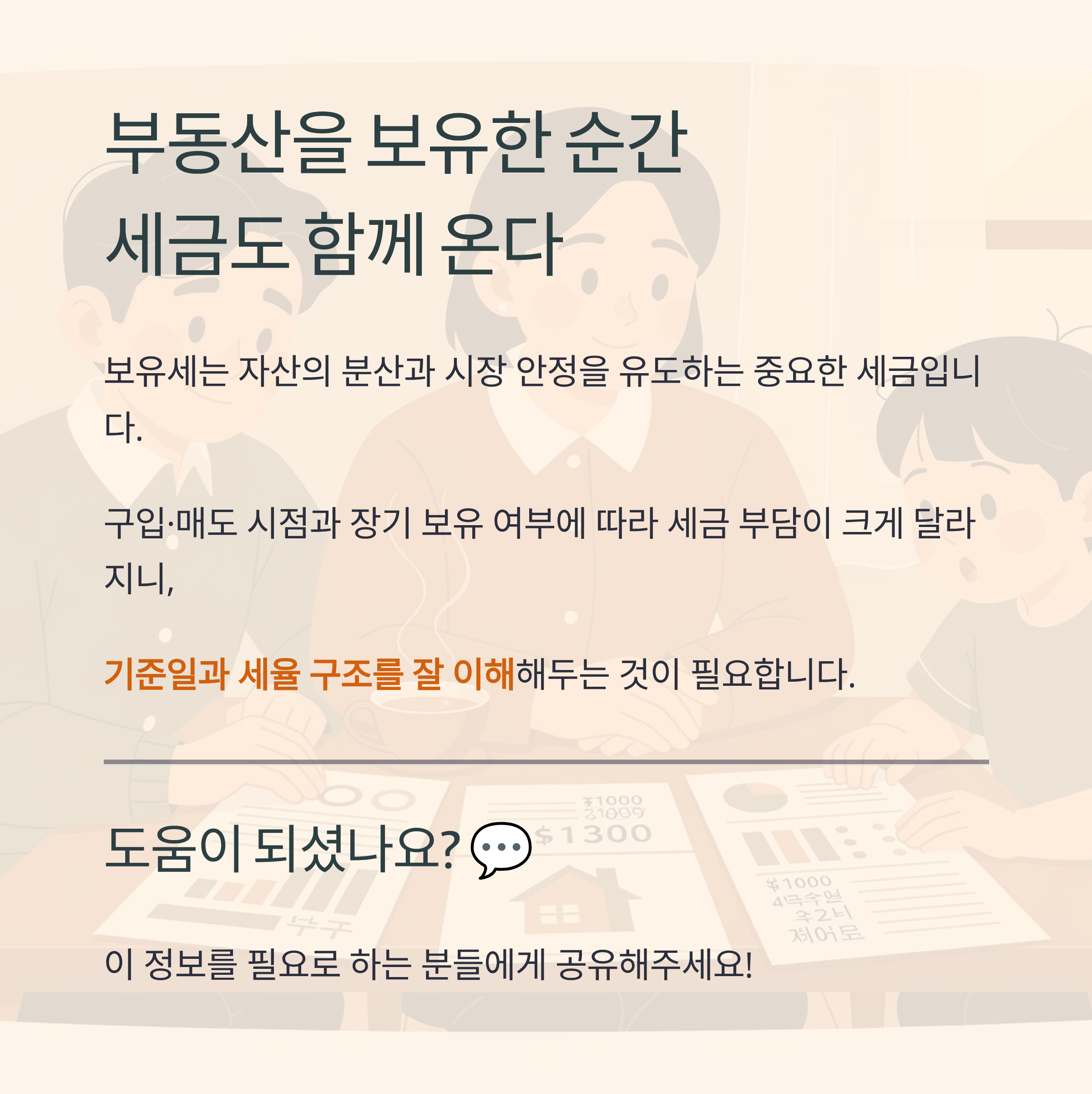부동산을 구입하거나 매도 시점, 혹은 장기 보유 여부에 따라 세금 부담이 크게 달라질 수 있으니, 기준일과 세율 구조를 잘 이해해 두는 것이 필요합니다.