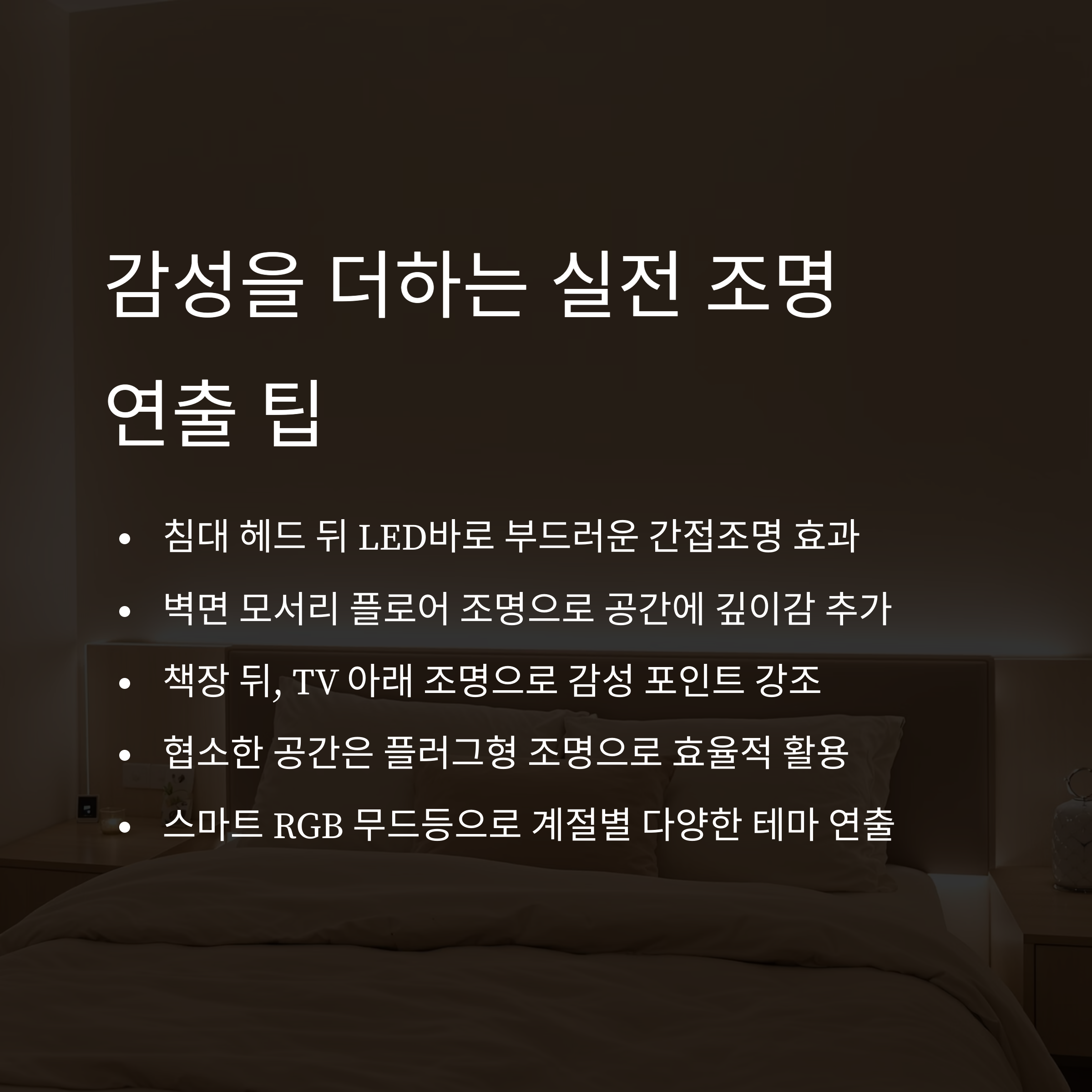| LED바 | 스티커로 부착 | 침대 헤드 뒤, 책장, 벽면 구석 |