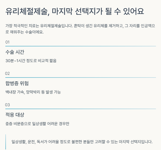특히 일상생활, 운전, 독서가 어려울 정도로 불편한 분들만 고려할 수 있는 마지막 선택지입니다.