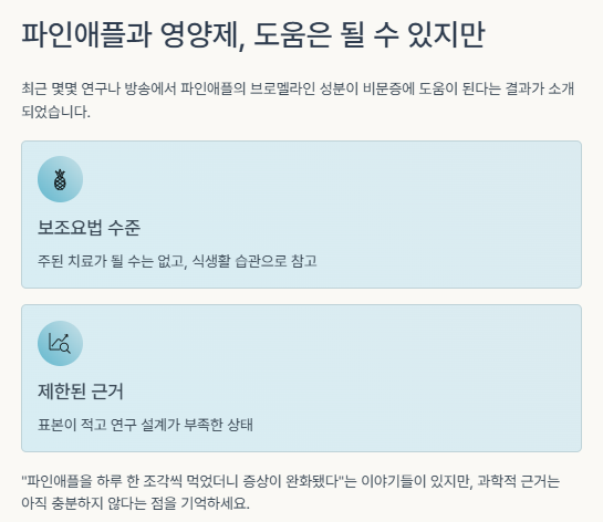 "파인애플을 하루 한 조각씩 먹었더니 증상이 완화됐다"는 이야기들이 있지만,
