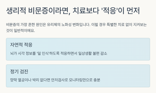 요약하자면, 비문증은 대부분 치료 없이도 자연스럽게 적응되는 경우가 많습니다.