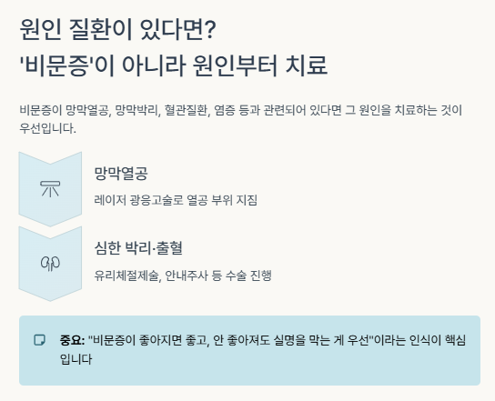 이런 경우는 "비문증이 좋아지면 좋고, 안 좋아져도 실명을 막는 게 우선"이라는 인식이 중요합니다.
