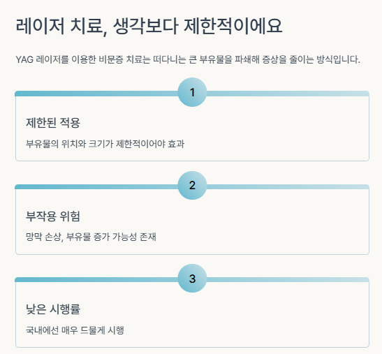일상에 큰 불편을 주는 중증 비문증 환자에서만 신중하게 선택됩니다.